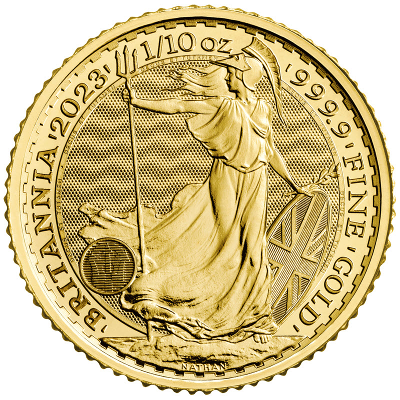 На реверсе монеты - персонифицированный символ Великобритании в виде молодой женщины в коринфском шлеме, с гербовым щитом и трезубцем Посейдона в руке. Легендарная фигура Британии символизирует британскую силу и единство на монетах со времен Римской империи. Фамилия художника NATHAN высечена маленькими буквами на скале под ногами Британии. На внутреннем ободке между центральным кругом с рисунком и внешним кантом с надписями многократно повторяются слова: DECUS ET TUTAMEN, что переводится как «Украшение и защита». Вдоль края монеты полукругом выгравированы надписи, разделенные точками: 'BRITANNIA' 2023' 1/10 oz ' 999.9 'FINE' GOLD'- (Британия, год чеканки, вес и проба золота).