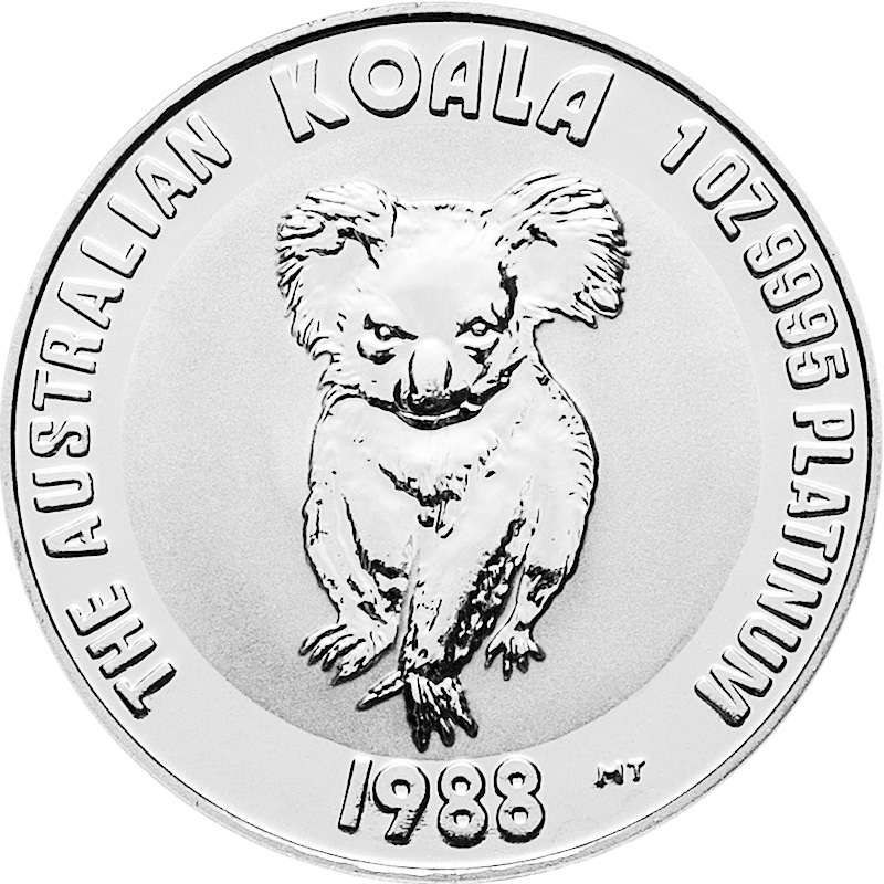 Платиновая монета Австралии "Коала", отчеканенная Пертским монетным двором, впервые была выпущена в 1988 году (серия «Американский платиновый орел» стартовала девять лет спустя, в 1997 году) после фантастического успеха «Золотой коалы» 1987 года. А первая австралийская серебряная монета «Коала» была выпущена в 2007 году. Регулярное производство серии из платины было прекращено после 2000 года из-за низкого спроса; впоследствии было лишь несколько юбилейных выпусков. Тираж: 62000 штуки.