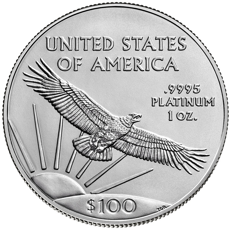 На реверсе изображен парящий орел на фоне восходящего солнца и его лучей. Вверху надпись: UNITED STATES OF AMERICA (страна-эмитент), справа: .9995 PLATINUM 1 OZ. (вес и проба платины). Внизу надпись: $100 (номинал), правее инициалы дизайнера TDR (Thomas D. Rogers).