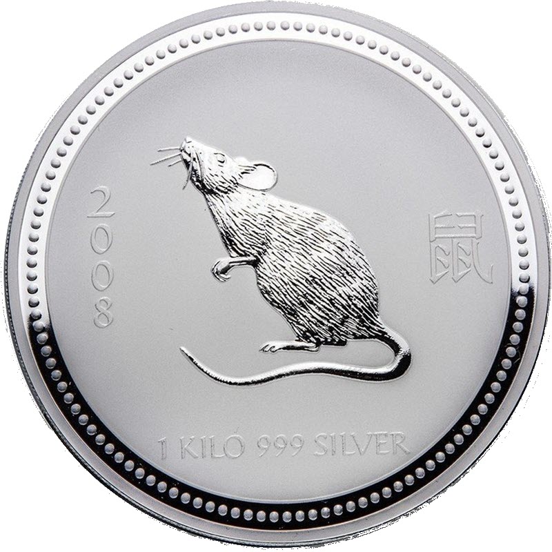 На реверсе изображен символ 2008 года – стоящая крыса, справа иероглиф, слева 2008, внизу 1 KILO 999 SILVER (1 килограмм серебра 999 пробы).