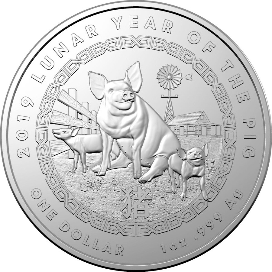 Изображение сельского двора, на котором расположилась семья свиней. По ободу название монеты — Лунный год Свиньи, номинал — 1 доллар, вес и чистота металла