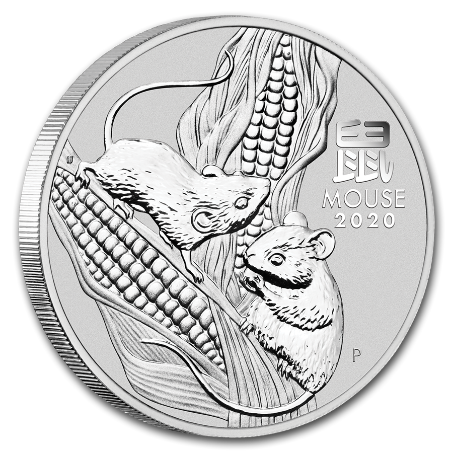Изображение двух мышей, кормящихся на початке кукурузы. Справа изображен китайский иероглиф «мышь», надпись «MOUSE 2020» и знак «Р» монетного двора Перта.