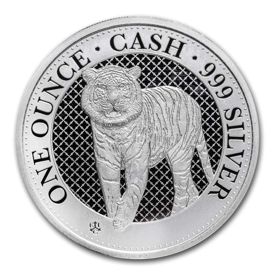 Детализированное изображение тигра на узорчатом фоне. Вес и чистота металла.
