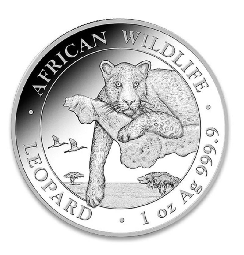 Серебряная инвестиционная монета Сомали - Леопард. Третья монета в рамках серии "Африканская дикая природа". Чеканка монеты производится на Баварском государственном монетном дворе.