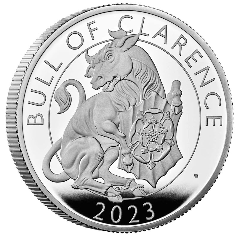 Серебряная монета «Бык Кларенса» из серии «Звери Тюдоров» от Королевского монетного двора Великобритании в качестве «Proof» и первая с портретом Короля Чарльза III. Дизайн Дэвида Лоуренса (David Lawrence).