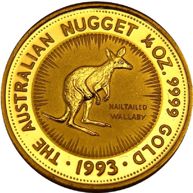 На реверсе изображен изображен кенгуру — валаби. По краю монеты надписи: "австралийский наггет", "1/4 унции", "золото 9999", "1993".