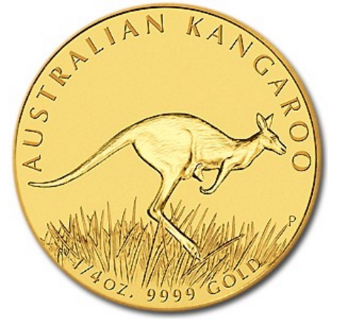 На реверсе представлен кенгуру — символ Австралии. Изображение меняется каждый год. Надпись AUSTRALIAN KANGAROO — австралийский кенгуру. Также указаны год выпуска монеты, вес 1/4 oz. и проба золота 0.9999. На данной монете изображен прыгающий кенгуру.