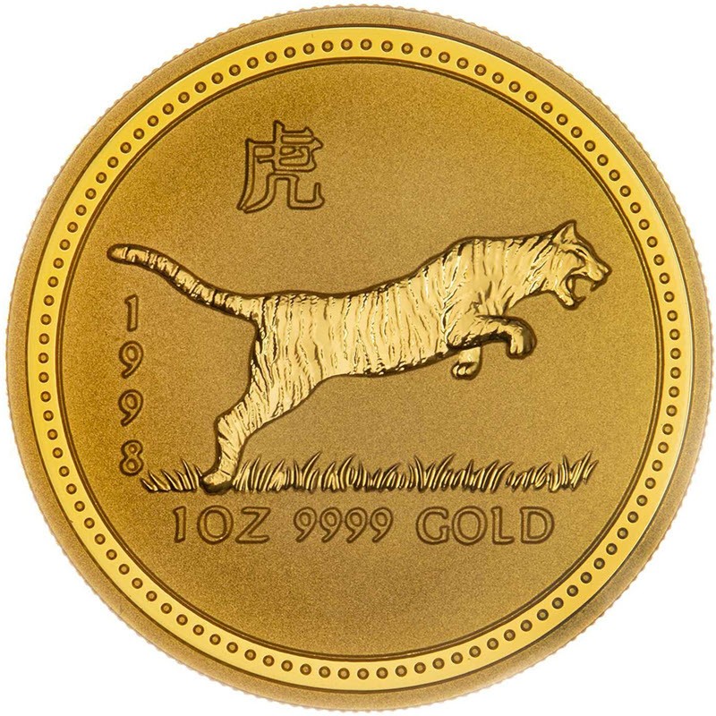 На реверсе изображен Тигр работы Миранды Корналл (Miranda Cornall). Слева надпись: 1998 (год чеканки), выше иероглиф: 虎 (Тигр). Внизу: 1 OZ 9999 GOLD (вес и проба золота).