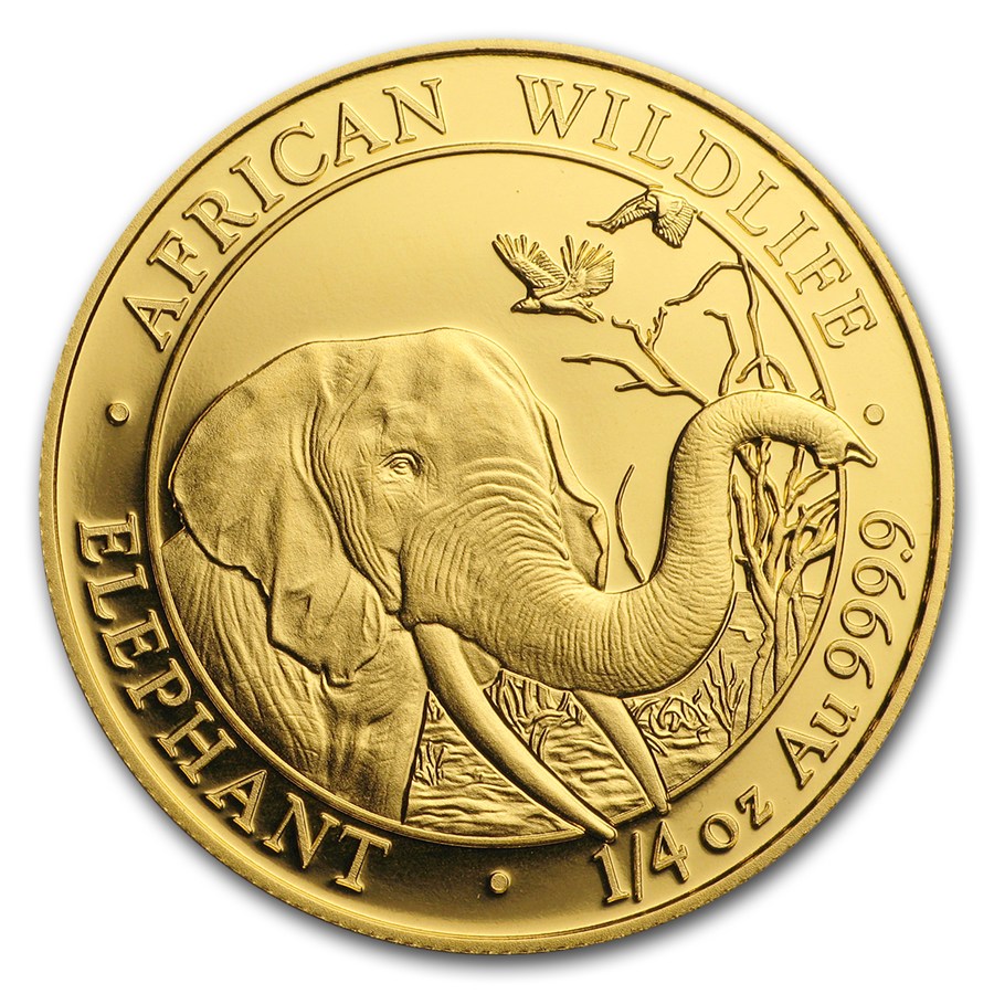 Золотая инвестиционная монета Сомали - Слон. Данная монета выпускается в рамках серии "Африканская дикая природа". Чеканка монеты производится на Баварском государственном монетном дворе. Изображение меняется ежегодно.