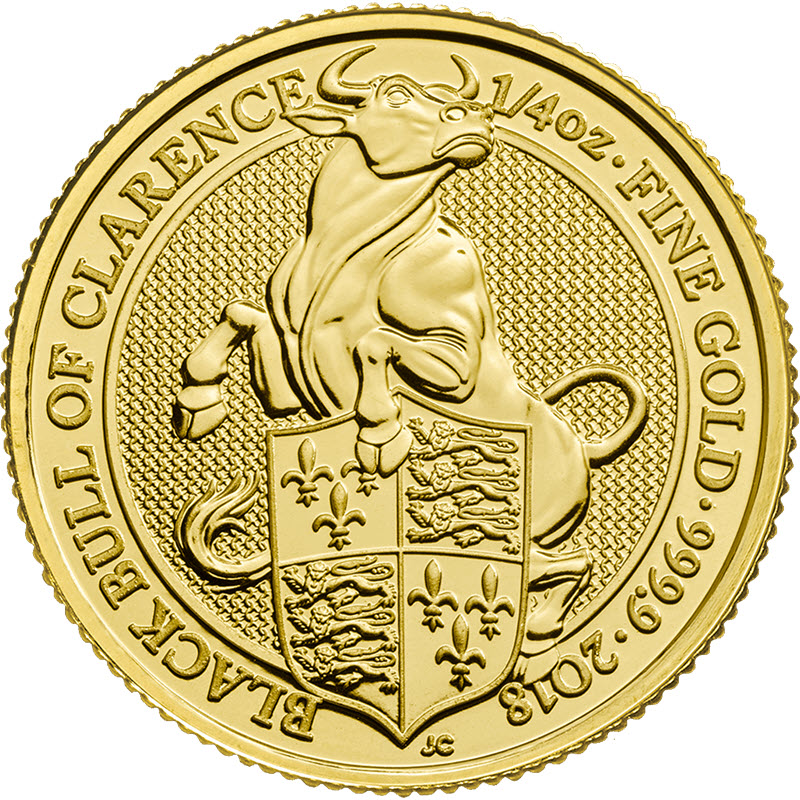 На реверсе золотой инвестиционной монеты "Черный бык" - изображение быка, держащего в лапах щит. По кругу монеты - надписи на английской языке, обозначающие "Черный бык Кларенса", 1/4 тройской унции чистого золота 999,9 пробы. Далее идет год выпуска монеты - 2018. Снизу, под изображением быка, указаны инициалы дизайнера монеты - JC (Jody Clark).