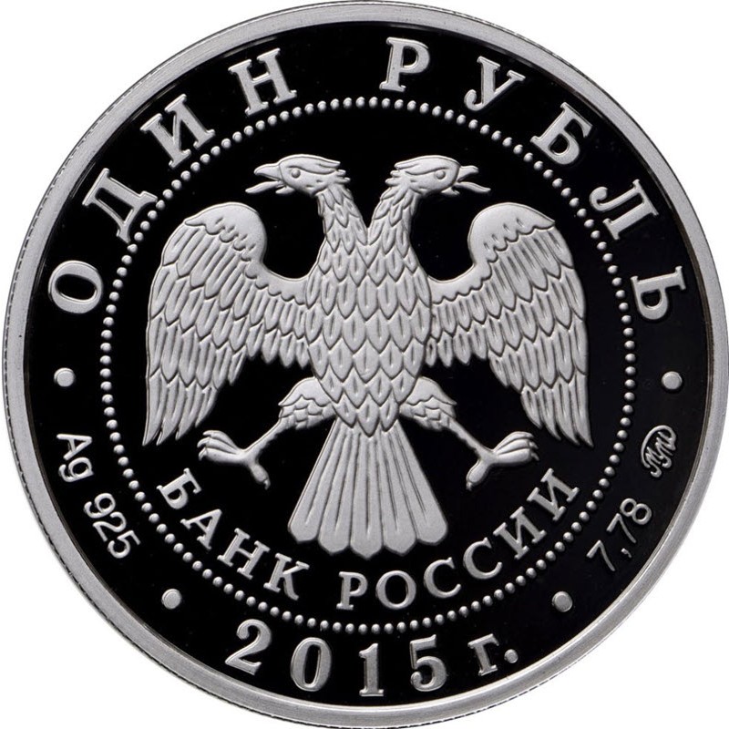 На аверсе изображена эмблема Банка России (двуглавый орел с опущенными крыльями), под ним надпись: БАНК РОССИИ. Вдоль канта надпись: ОДИН  РУБЛЬ • Ag 925 • 2015 г. • 7,78 ММД • (номинал, вес и проба серебра, год чеканки, монограмма Московского монетного двора).