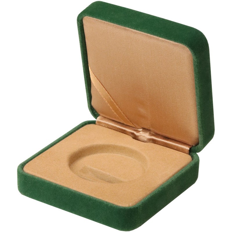 Подарочный бархатный футляр зеленого цвета для монет с капсулой диаметром 46 мм. Наружный размер: 80 Х 80 Х 35 мм. Флокированный ложемент бежевого цвета: 46 мм, глубина 6 мм.