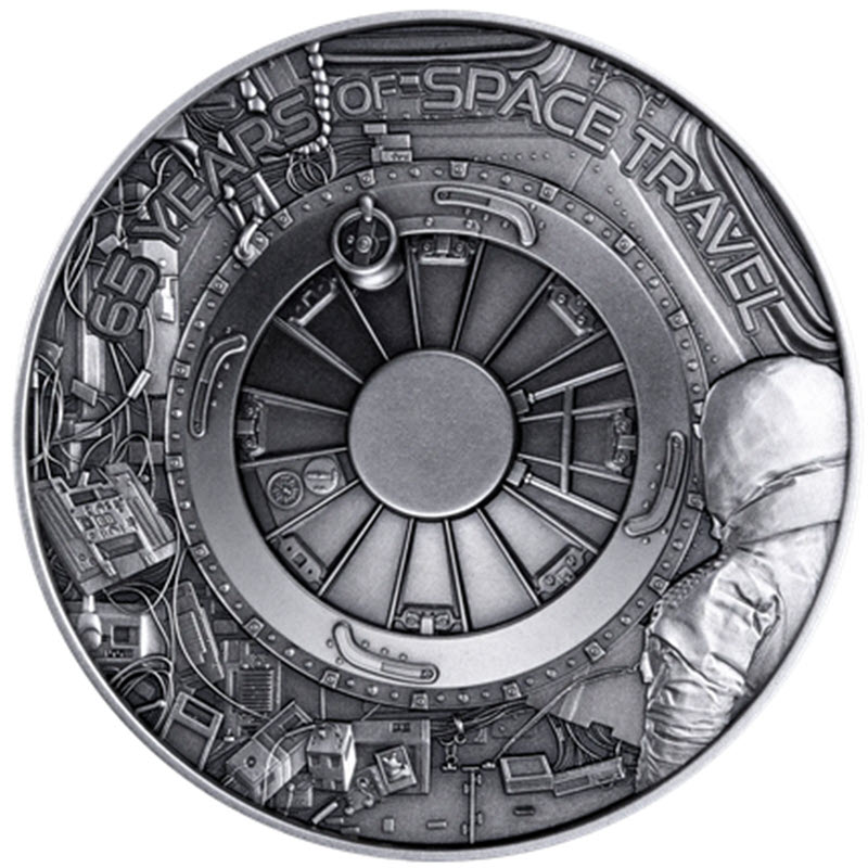 На реверсе верхней монеты изображен люк корабля в окружении аппаратуры, панелей и кабелей. Вверху надпись: 65 YEARS OF SPACE TRAVEL. При съеме магнитной крышки открывается вид на Землю из космоса. Вверху надпись: 65 YEARS OF SPACE TRAVEL.