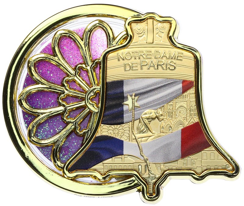 Эта уникальная медно-серебряная монета весом посвящена «Эммануилу» - большому бурдону Нотр-Дама. У нее качество BU, выборочное золочение и селективная окраска. Поставляется в футляре с сертификатом подлинности. Тираж: 666 штук.