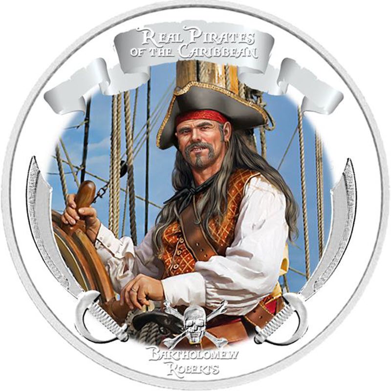 На реверсе монеты изображен в цвете знаменитый пират Бартоломью Робертс за штурвалом корабля в окружении изогнутых сабель. Вверху в ленте надпись REAL PIRATES OF THE CARIBBEAN. Внизу, под символом черепа и скрещенных костей, BARTHOLOMEW ROBERTS.