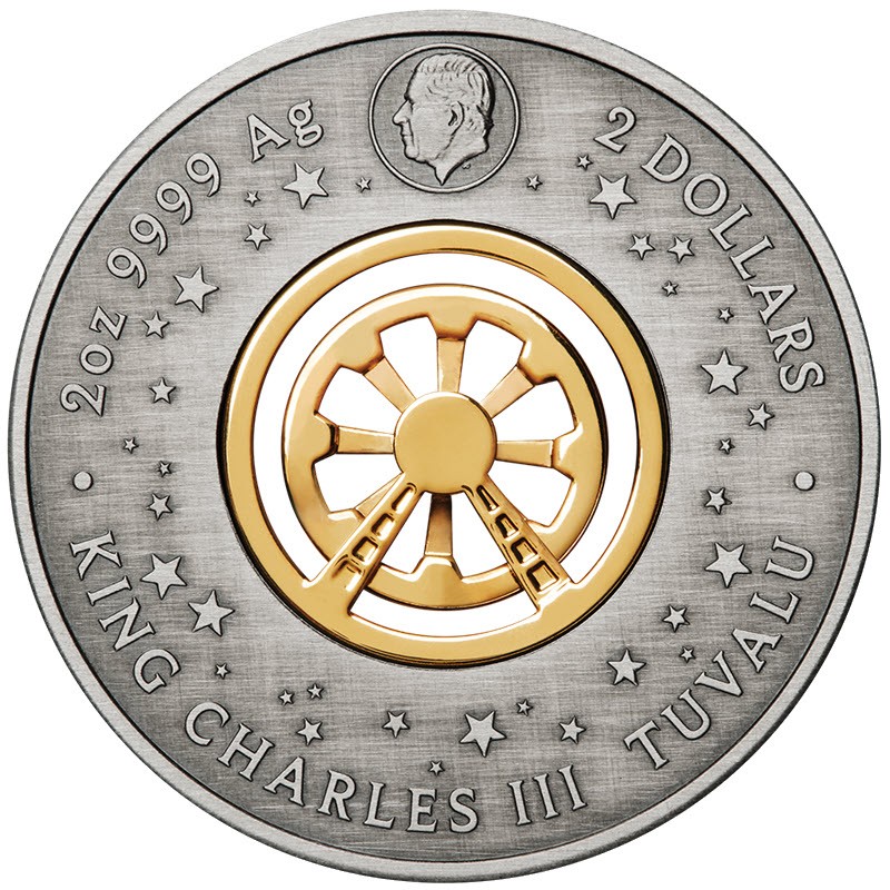 На аверсе вверху изображен Его Величество король Чарльз III на фоне звезд. На усечении шеи инициалы дизайнера JC (Jody Clark). Вдоль канта надпись: 2 oz 9999 Ag 2 DOLLARS KING CHARLES III TUVALU (вес и проба серебра, номинал, Король Чарльз III, страна-эмитент).