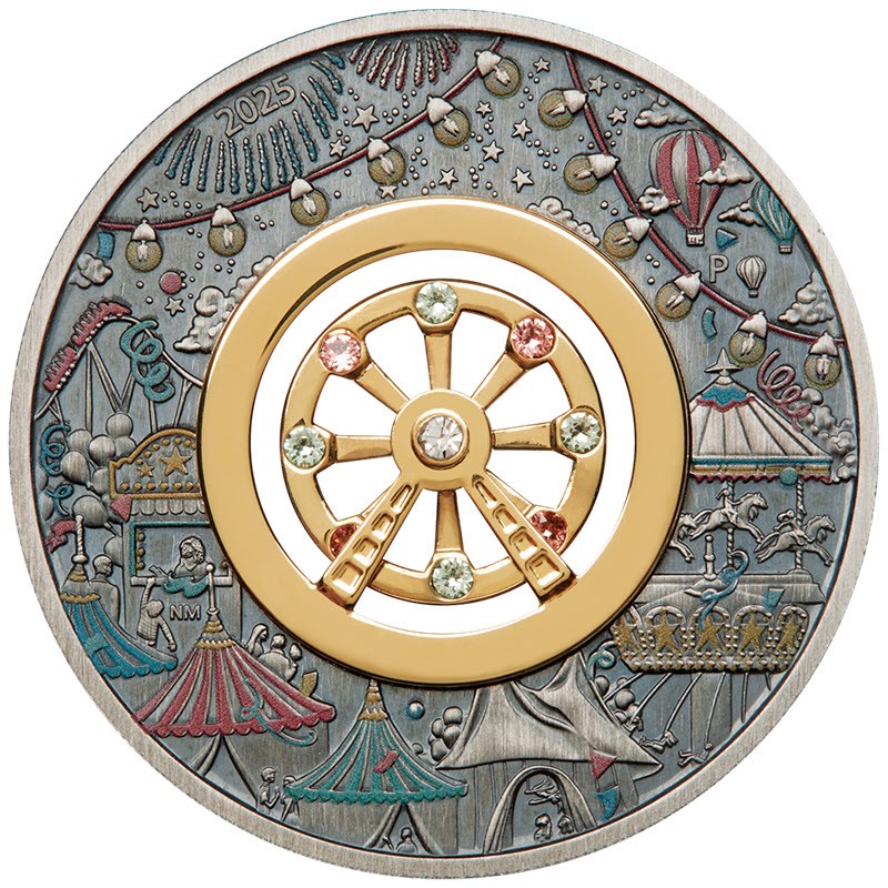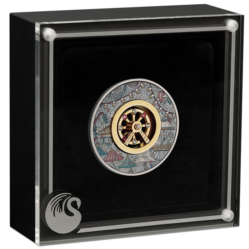 Эта чудесная серебряная монета весом в 2 унции посвящена культовому колесу обозрения. У нее прекрасный дизайн и качество античной отделки, выборочное золочение и вставки кристаллов Swarovski. Встроенное в монету миниатюрное колесо обозрения вращается. Поставляется в оригинальном футляре с сертификатом. Тираж: 2000 штук.