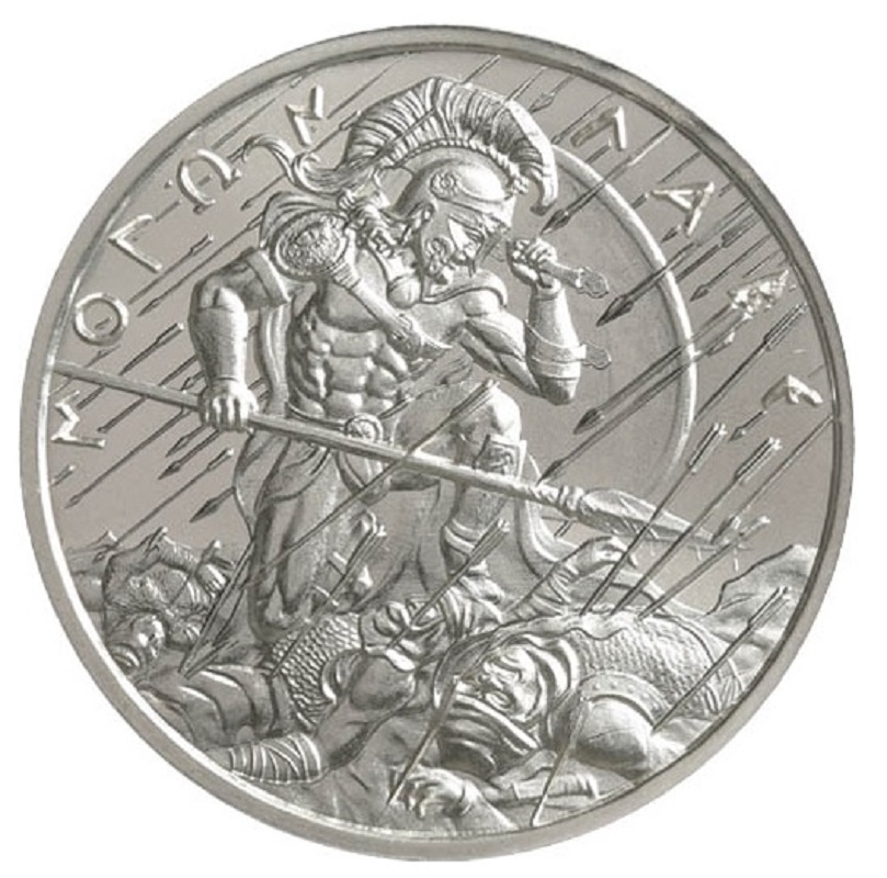 На аверсе изображен спартанский солдат, противостоящий персидской армии. Когда десятки персидских солдат лежат мертвыми у его ног, этот спартанский воин становится на колени, поднимает свой щит высоко, чтобы защитить себя от натиска стрел, исходящих от персов. Леонидас был королем Спарты, городом-государством в центре Древней Греции. Спартанская армия высоко ценилась как самая эффективная боевая сила в древнем мире. Несмотря на худшие показатели по сравнению со многими противниками, высококвалифицированные и умелые спартанцы часто выходили из боя победителями.