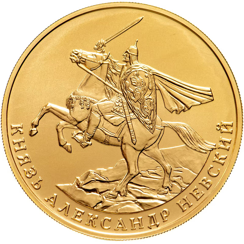 Реверс золотой монеты представляет выпуклое изображение Александра Невского в боевых доспехах, сидящего на коне, с поднятым мечом.