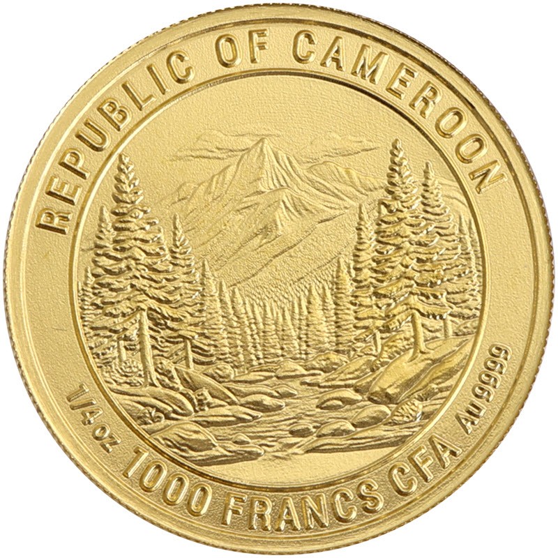 На аверсе изображена стремительная река в окружении лесов на фоне гор. Вдоль канта надпись: REPUBLIC OF CAMEROON 1/4 oz 1000 FRANCS CFA Au 9999 (страна-эмитент, вес и проба золота, номинал).