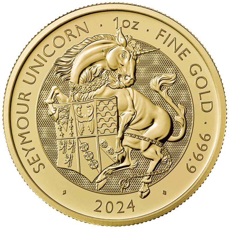 Золотая монета Великобритании "Звери Тюдоров. Единорог Сеймура" 2024 г.в., 31.1 г чистого золота (проба 9999)
