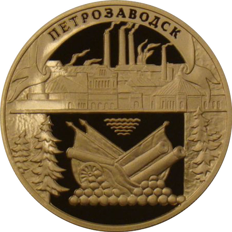 В обрамлении стилизованного окна-арки вверху - панорама заводских корпусов на берегу озера, внизу в центре - знамeна, артиллерийские орудия с ядрами, слева и справа - ели, по окружности - надпись: "ПЕТРОЗАВОДСК".