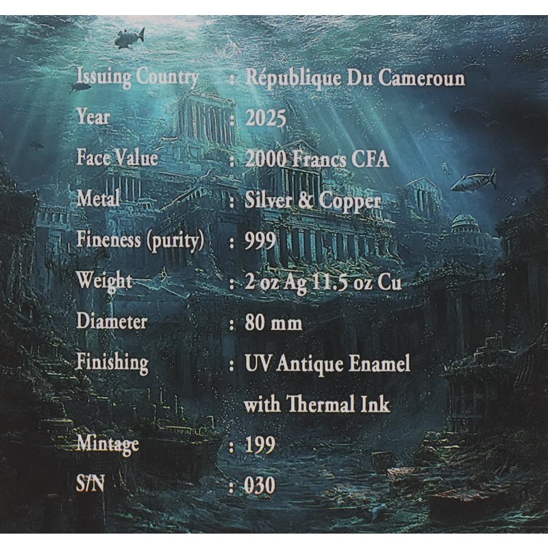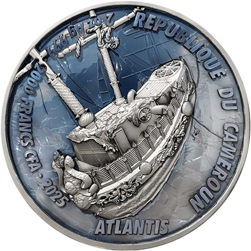 На аверсе изображение затонувшего корабля. Вдоль канта надпись: REPUBLIQUE DU CAMEROUN 2 oz Ag 999 · 2000 FRANCS CFA · 2025 ATLANTIS (страна-эмитент, вес и проба серебра, номинал, год чеканки, Атлантида). На гурте индивидуальный номер монеты.