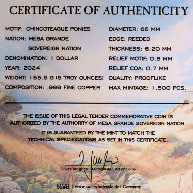 Эта прекрасная медная монета США весом 5 унций из серии "Свобода жизни" - посвящена пони Чинкотинг. Племя Меса - Гранде признано правительством США в качестве суверенной нации, которая имеет право выпускать собственные монеты. У нее качество BU и высокий рельеф. Поставляется в капсуле с сертификатом подлинности. Тираж: 1500 штук.