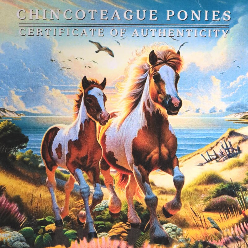 На реверсе изображены два пони на острове. Вверху вдоль канта надпись: VIRGINIA - CHINCOTEAGUE PONIES (Вирджиния – Пони Чинкотиг), вниз: 2024 ONE DOLLAR (год чеканки, номинал).