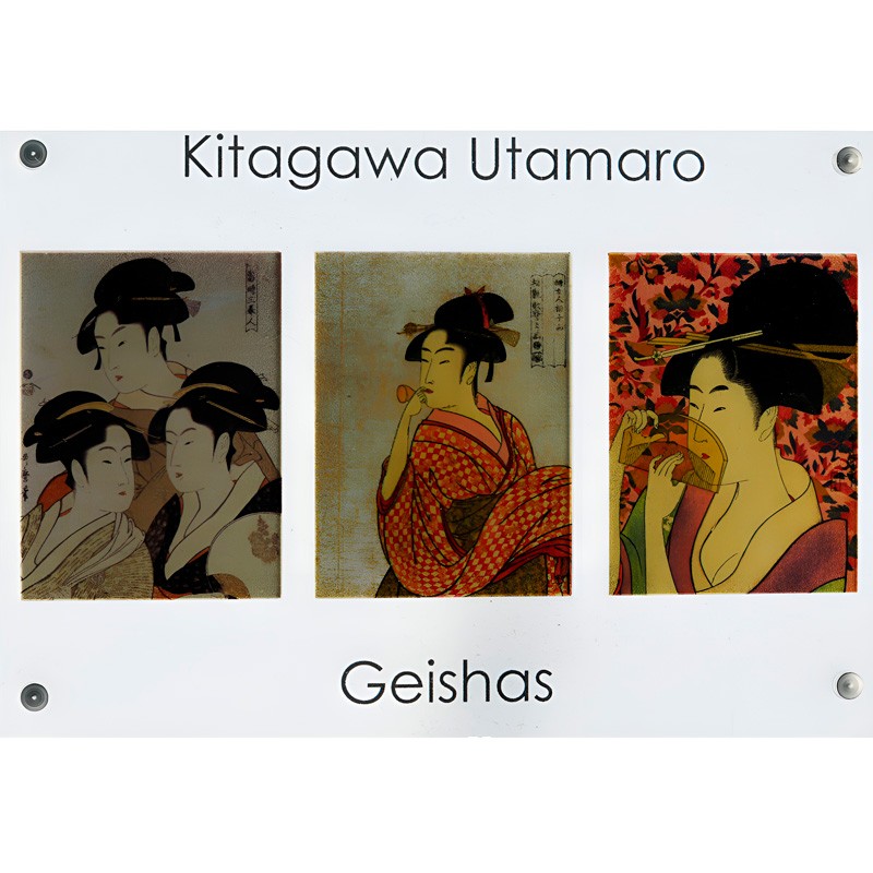Особенностью реверса является отсутствие каких-либо надписей или канта, что создает эффект цельной миниатюрной картины. На самом акриловом блоке вверху имя художника - Kitagawa Utamaro (Китагава Утамаро), а внизу — название серии — Geishas (Гейши).