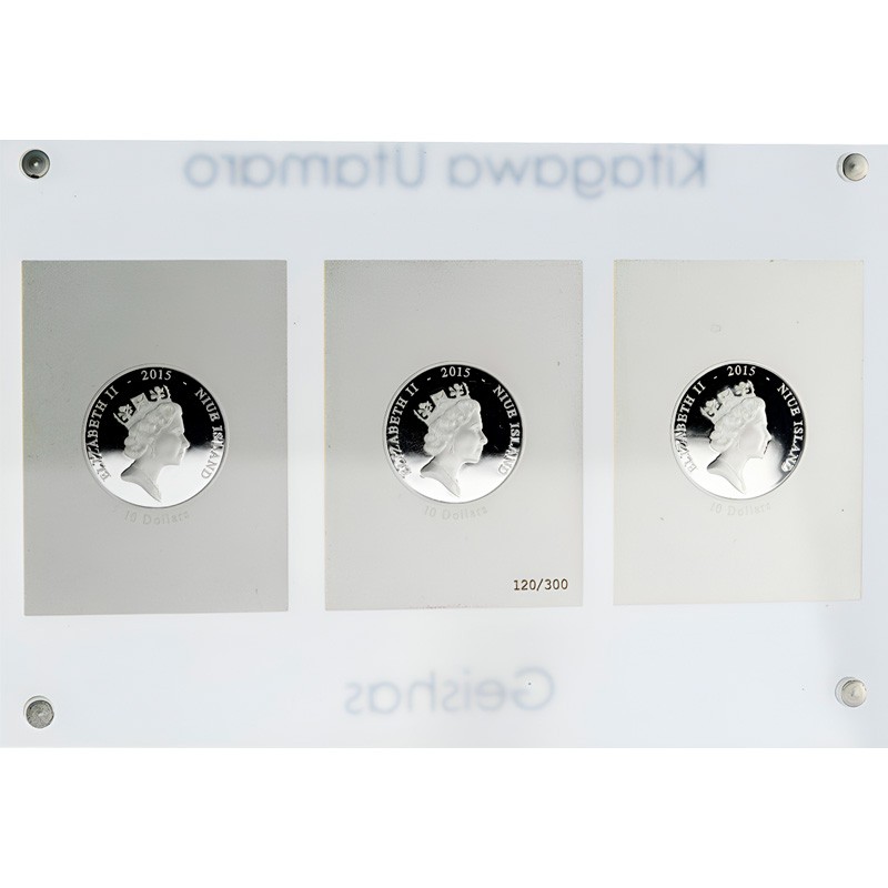 Этот чудесный набор из трех серебряных монет общим весом 120 грамм прямоугольной формы посвящен творчеству знаменитого японского художника Китагавы Утамаро (1753–1806), мастера направления укиё-э. Каждая монета имеет размеры 36,0 x 48,0 мм, селективную окраску, качество пруф. Поставляются в прозрачном акриловом блоке. Ограниченный тираж - всего 300 наборов по всему миру.