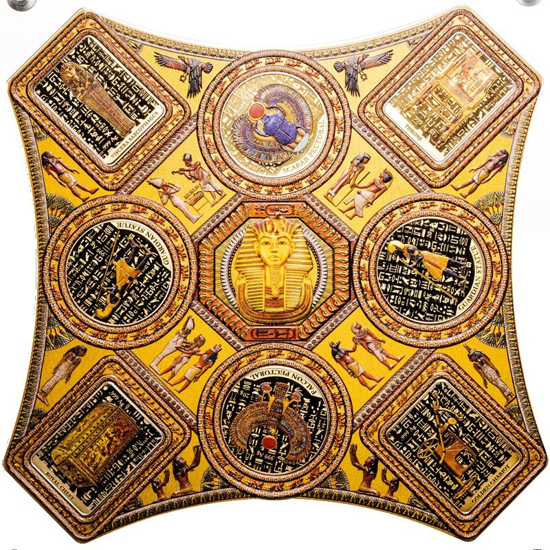 На реверсе каждой серебряной монеты изображен артефакт, найденный в гробнице самого молодого фараона египетской империи — он умер всего в 18 лет! Открытие было сделано археологом Говардом Картером 29 ноября 1922 года в Долине царей, недалеко от города Луксор на юге Египта. Каждая монета имеет специальные функции: дополнительная чеканка, чеканка микрокласса, нанесение аутентичного цвета, нанесение полупрозрачного цвета, нанесение микрозолота 999 пробы и нанесение матового золота.