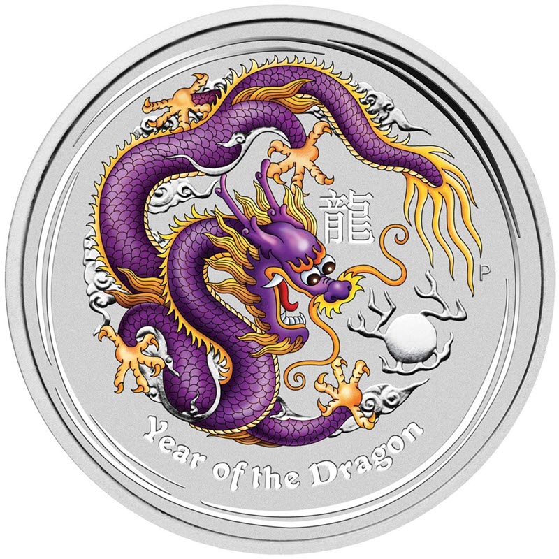 На реверсе изображение китайского дракона в фиолетовом цвете, преследующего пылающую жемчужину. Над головой дракона китайский иероглиф: 龍 (дракон). Справа монограмма Пертского монетного двора: Р. Внизу надпись: Year of the Dragon.