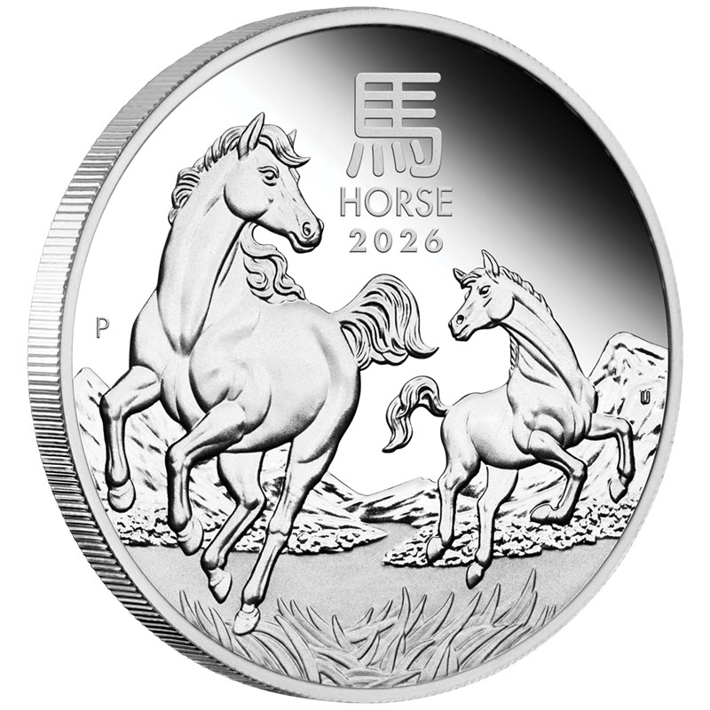 На реверсе изображены скачущие лошади на фоне гор. Вверху надпись: 馬 HORSE 2026 (Год Лошади, год чеканки). Слева у канта: Р (монограмма Пертского монетного двора), справа инициалы дизайнера: IJ (Ing Ing Jong).