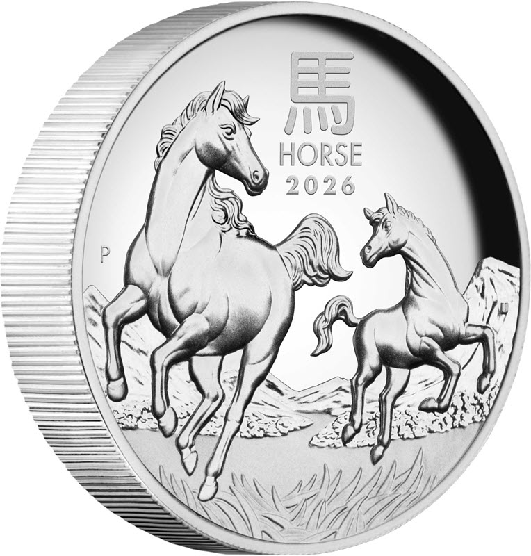 На реверсе изображены скачущие лошади на фоне гор. Вверху надпись: 馬 HORSE 2026 (Год Лошади, год чеканки). Слева у канта: Р (монограмма Пертского монетного двора), справа инициалы дизайнера: IJ (Ing Ing Jong).
