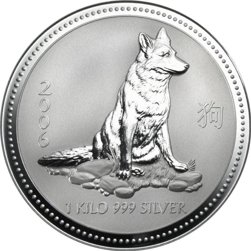 На реверсе изображена овчарка, сидящая среди камней в траве. Слева указан год чеканки: 2006, справа китайский иероглиф: 狗 (Год Собаки), внизу: 1 KILO 999 SILVER (вес и проба серебра).
