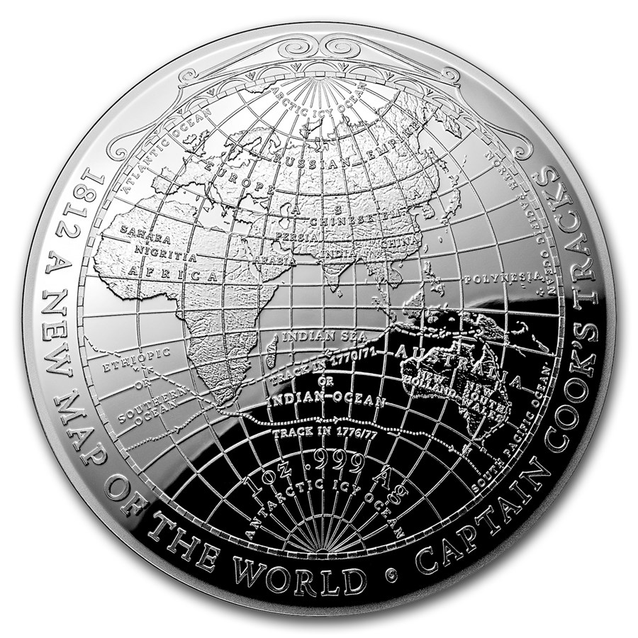 Серебряная монета Австралии "Новая карта мира - Путь Капитана Кука" 2019 г.в., 31,1 г чистого серебра (Проба 0,999)