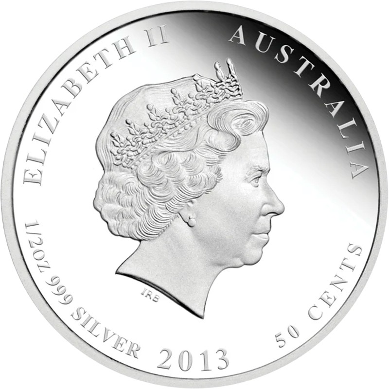 На аверсе изображен профиль королевы Елизаветы II дизайнера Яна-Рэнка Бродли. Вверху надпись ELIZABETH II AUSTRALIA (Елизавета II, страна-эмитент). Внизу по ободу указан год чеканки (2013), номинал монеты (50 CENTS), вес (1/2 oz) и проба серебра в монете (999 SILVER).