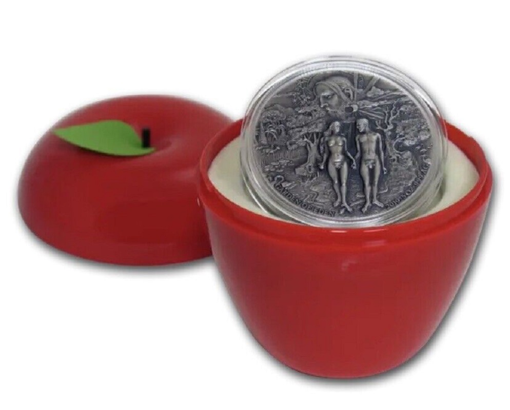 Эта невероятная серебряная монета весом в 5 унций посвящена одному из самых важных символов христианства – Эдемскому саду. У монеты впечатляющие высокие рельефы, красивый дизайн, античная отделка и она поставляется в футляре в форме яблока вместе с сертификатом подлинности. Ограниченный тираж всего 750 штук по всему миру..