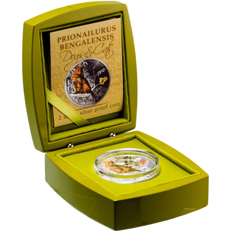 Эта чудесная серебряная монета весом 1 унция из серии «Собаки и кошки» (Dogs&Cats) посвящена бенгальской кошке.