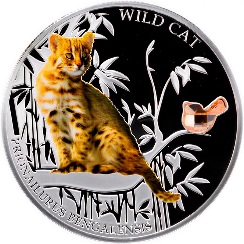 В центре – цветное изображение бенгальской кошки на фоне бамбуковых ветвей. Справа - вставка из розового кристалла Сваровски в форме птички. Вверху надпись WILD CAT (Дикий кот), внизу — латинское название вида — PRIONAILURUS BENGALENSIS (Бенгальская кошка).