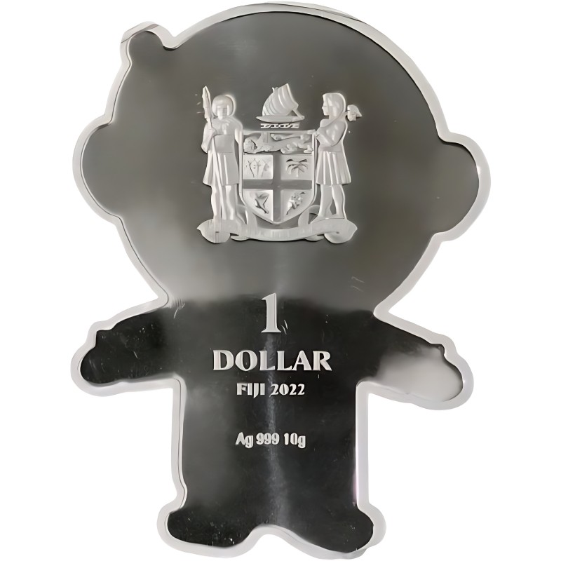 В центре - изображение герба Фиджи: геральдический щит, который с двух сторон держат два фиджийских воина, одетые в традиционные юбки из тапы. Левый воин держит копье, правый — дубину-тотокиа. Над щитом расположено изображение традиционного фиджийского каноэ-такиа с парусом. Под щитом на ленте надпись: Rerevaka na Kalou ka doka na Tui (Бойся Бога и почитай Короля). Под гербом надписи: 1 DOLLAR FIJI 2022 Ag 999 10g (номинал, страна-эмитент, год чеканки, вес и проба серебра).