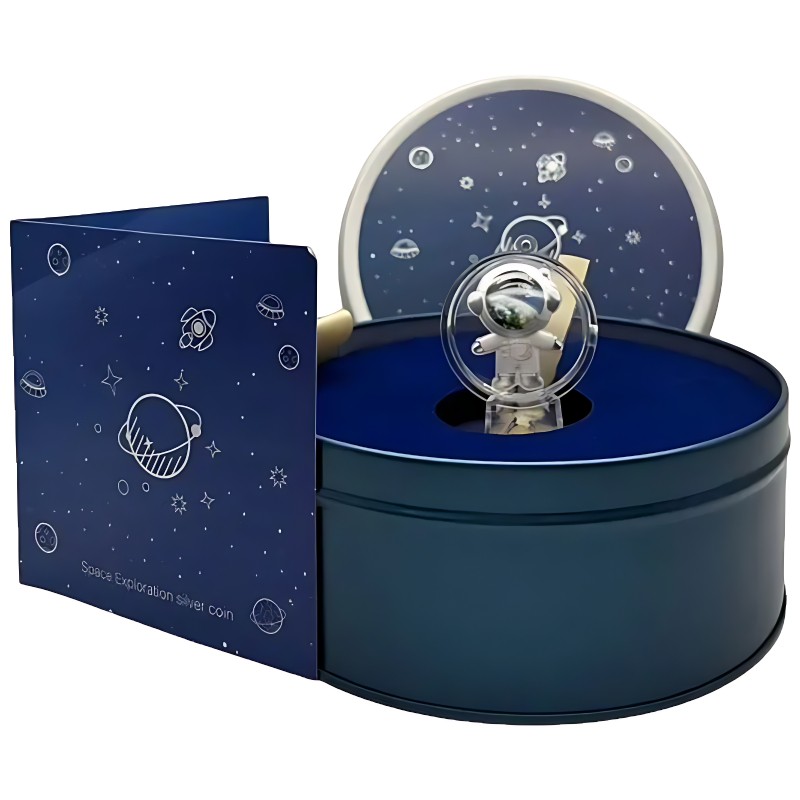 Эта прекрасная серебряная монета выполнена в форме астронавта и посвящена теме исследования космоса.