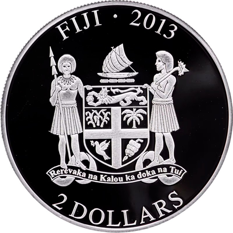 Вверху вдоль канта надпись: FIJI 2013 (страна-эмитент, год чеканки), внизу - 2 DOLLARS (номинал).