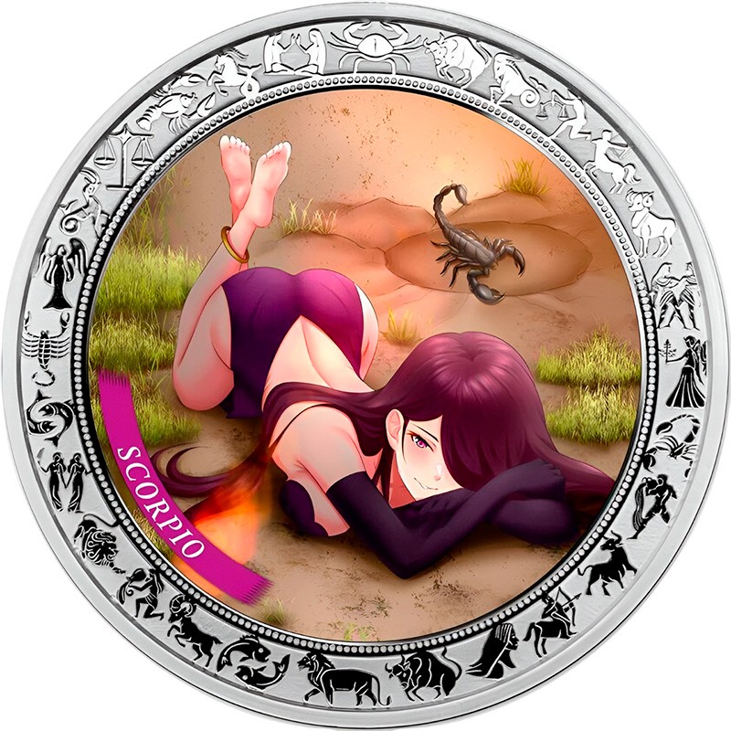 Эта красивая серебряная монета из серии “Аниме Зодиак“ посвящена восьмому астрологическому знаку зодиака - “Скорпион” (Scorpio). Считается, что к нему принадлежат рождённые с 24 октября по 22 ноября. Скорпионы наделены природным магнетизмом и твёрдым характером. Устойчивы к трудностям и эмоционально сдержанные, они умеют хранить тайны и высоко ценят преданность. Люди-скорпионы, постоянно работают над собой и посвящают свою жизнь улучшению окружающего мира.