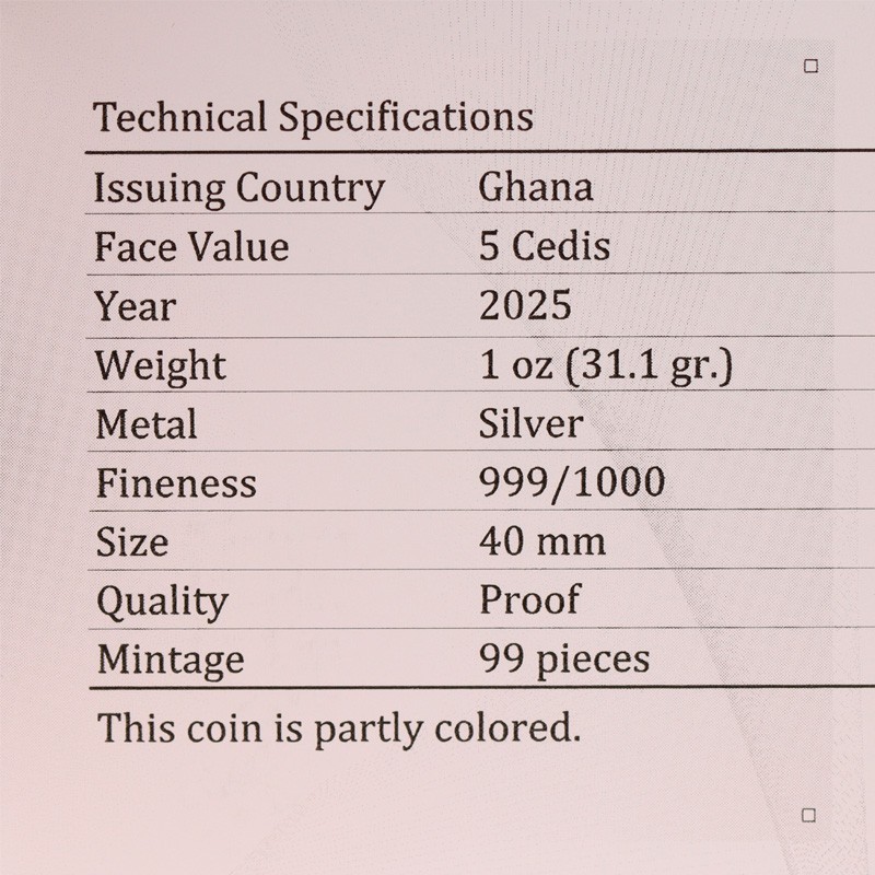 На аверсе монеты изображен государственный герб Ганы и надписи: REPUBLIC OF GHANA FIVE CEDIS 1 OZ.999 FINE SILVER 2025 (страна-эмитент, номинал, вес и проба серебра, год чеканки).