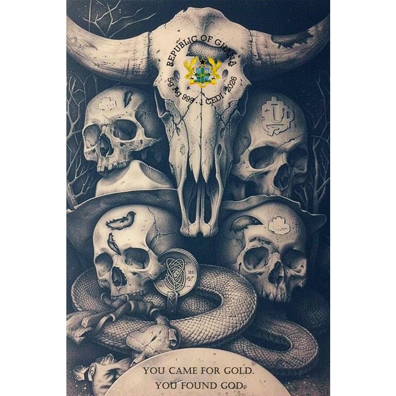 На аверсе на фоне черепов вверху изображен герб Ганы. Вокруг герба надпись: 5g Ag 999 · 1 CEDI · 2026 (проба серебра, номинал, год чеканки). Внизу надпись: YOU CAME FOR GOLD. YOU FOUND GOD (Ты пришёл за золотом. Ты нашёл Бога).