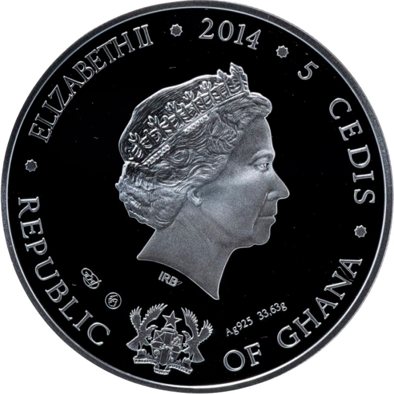На аверсе в центре портрет Её Величества королевы Елизаветы II дизайнера Яна Рэнка-Бродли (IRB). Вокруг надписи: ELIZABETH II  REPUBLIC OF GHANA ∙ 5 CEDIS  2014 (Елизавета II, страна-эмитент, номинал, год чеканки). В нижней части расположен герб Ганы, около которого надписи: Ag925 33,63g (вес и проба серебра) и монограмма монетного двора – СПМД.