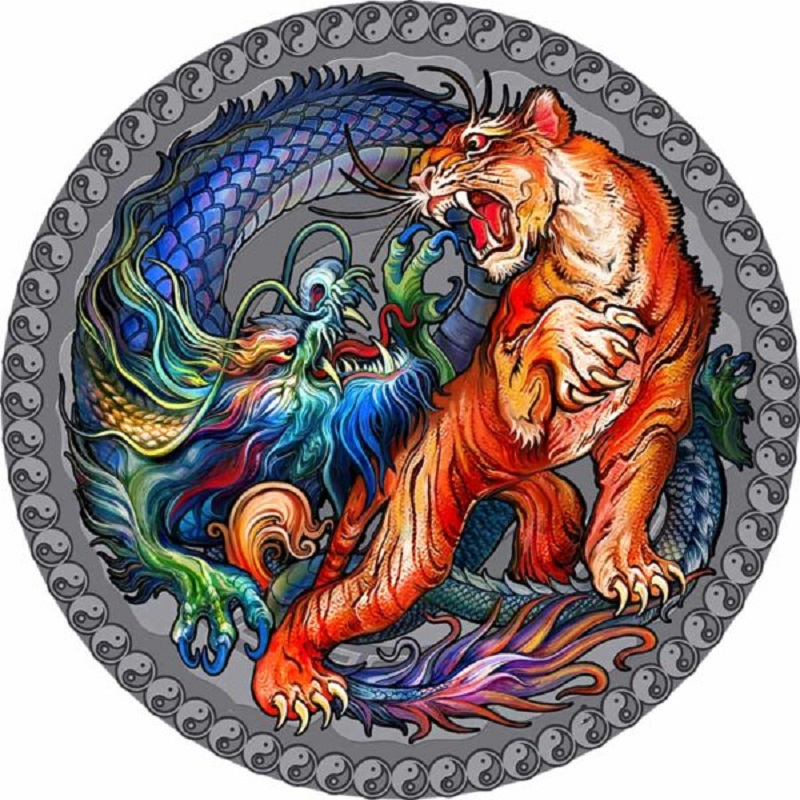 На реверсе монеты изображены яркие цветные изображения Тигра и Дракона, двух древних китайских символов Инь и Ян.