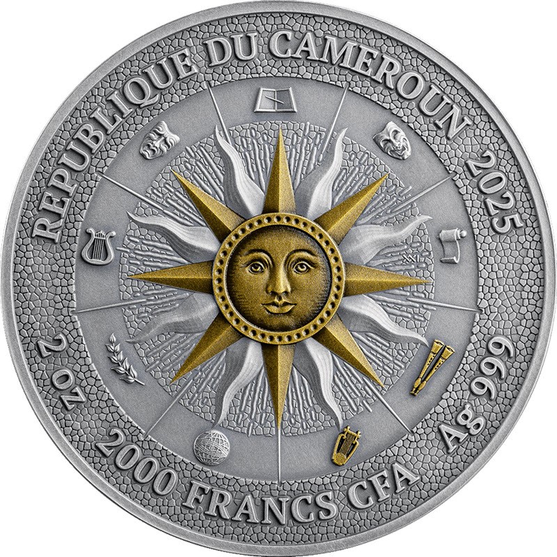 На аверсе изображено Солнце в окружении символических атрибутов каждой музы. Вдоль канта надпись: REPUBLIQUE DU CAMEROUN 2025 2 OZ 2000 FRANCS CFA Ag 999 (страна-эмитент, год чеканки, номинал, вес и проба серебра).